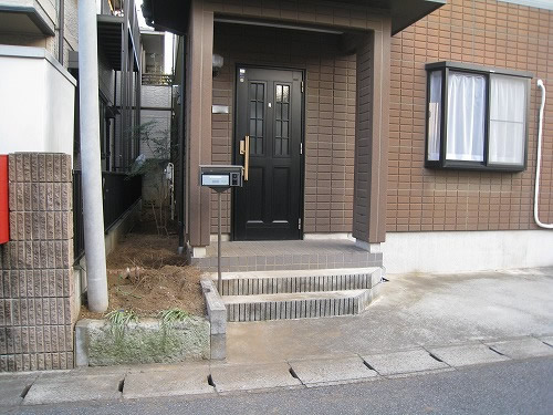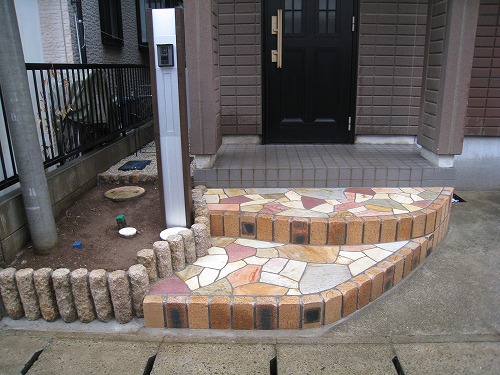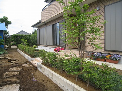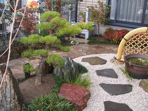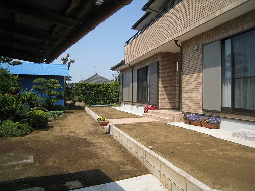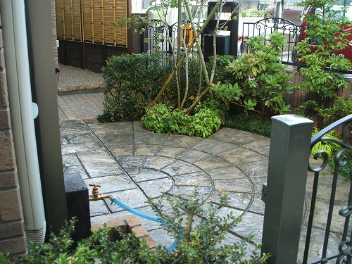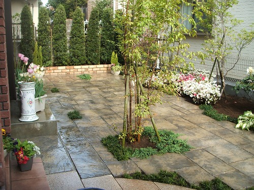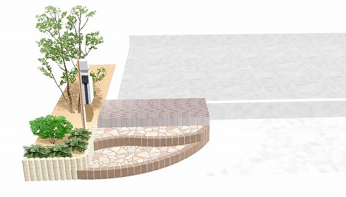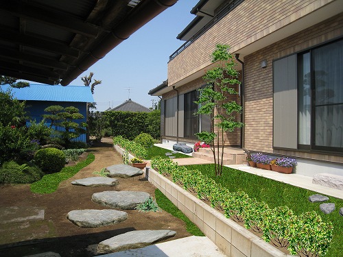 写真に植栽・飛び石を合成して完成予想図を出しました。 中央が合成写真。右が完成写真です。